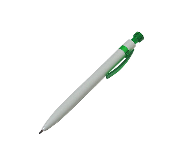 Bolígrafo retráctil con cuerpo blanco, clip y pulsador de color.