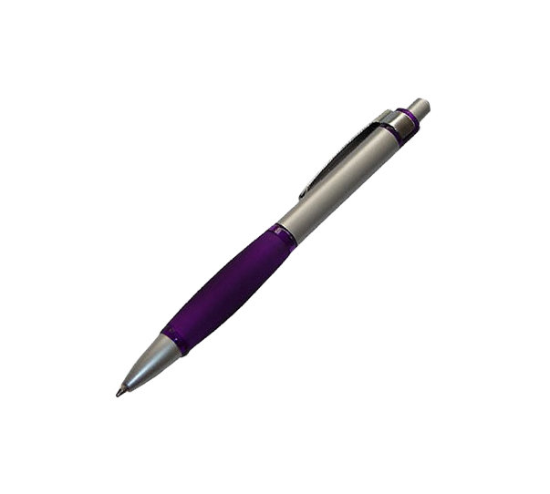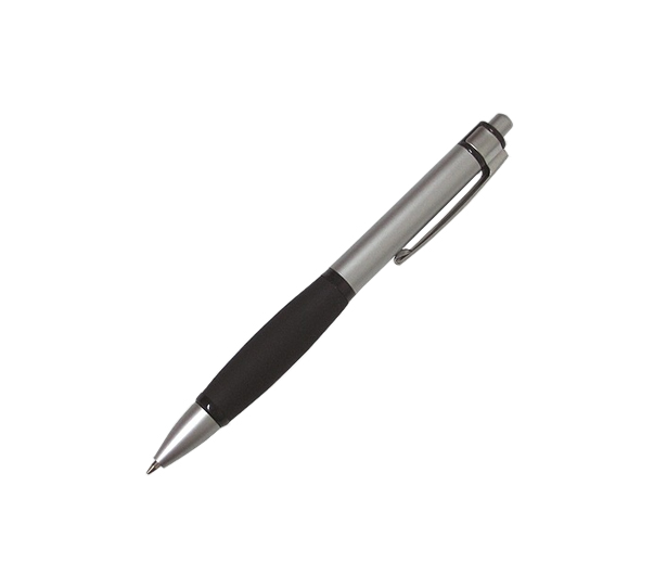 Bolígrafo retráctil con cuerpo plateado acabado mate, grip y detalles de color.