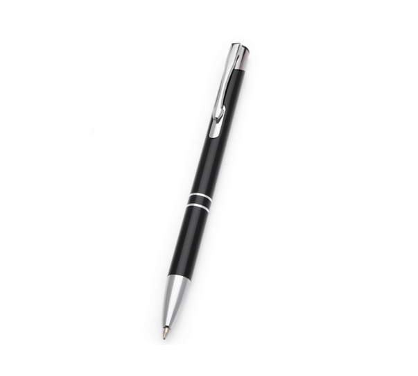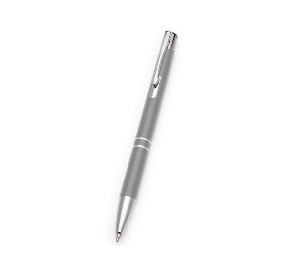 Bolígrafo métalico con sistema de apertura retráctil. Cuerpo de color y detalles plateados.