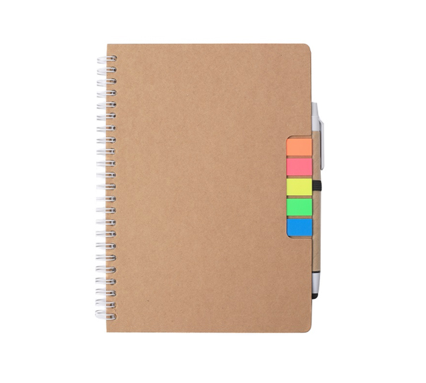 Cuaderno ecológico espiralado de 70 hojas rayadas de papel obra blanco. Entretapa con 5 colores de post its. Incluye bolígrafo eco con punta touch. Medidas: 21 x 15 cm