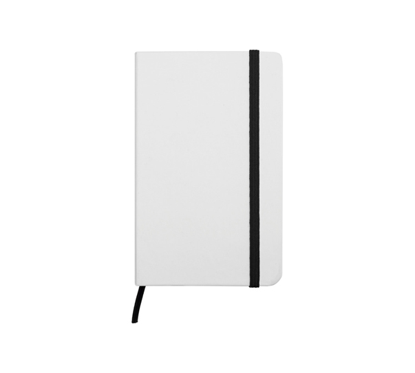 Libreta de tapa dura color blanco. Posee 80 hojas rayadas. Cuenta con separador de tela y cierre con banda elástica del mismo color. Medidas: 14,3 x 9 x 1,2 cm