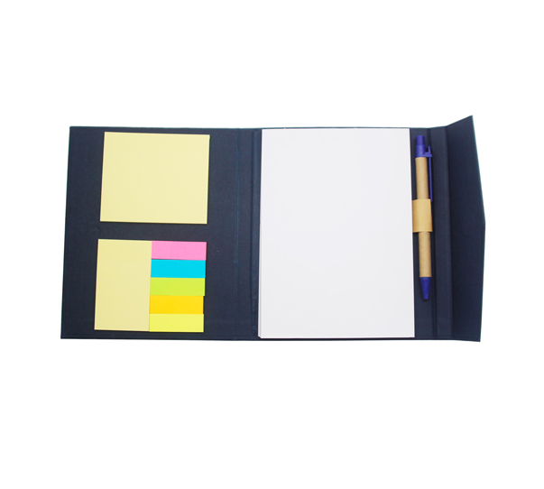 Libreta ecológica con cierre imantado. Incluye bolígrafo retráctil ecológico. Contiene 1 block de 70 hojas lisas, 1 block de hojas post it de 9 x 7,5 cm, 1 block de hojas post it de 7,5 x 4,5 cm y 5 mini block de hojas post it de 4,5 x 1,5 cm. Medidas: 18 x 14,5 cm