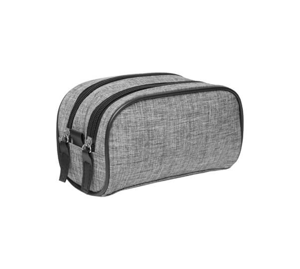 Poliéster 600D. 25,5 x 19 x 8 cm. Colgante. Cierre de apertura completa. 2 compartimentos internos plásticos transparentes. 2 bolsillos internos de red. 1 compartimento interno inferior.