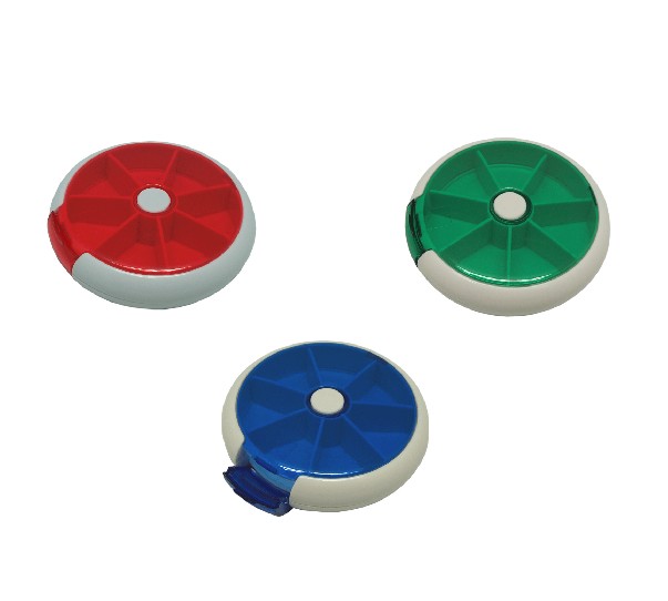 Pastillero circular 7 compartimientos. Con botón de pulsador de rotación.