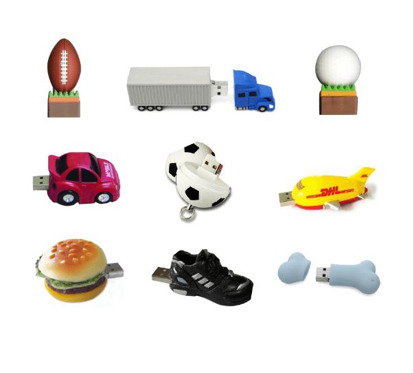 Pendrives de goma con formas varias. Modelo y capacidad a elección y a combinar con el cliente.