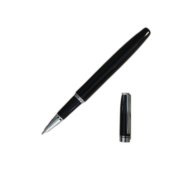 Roller con cuerpo metálico engomado con tinta gel. Clip y detalles color plata. Decape electroplateado en la parte superior. Estuche con cierre magnético.
