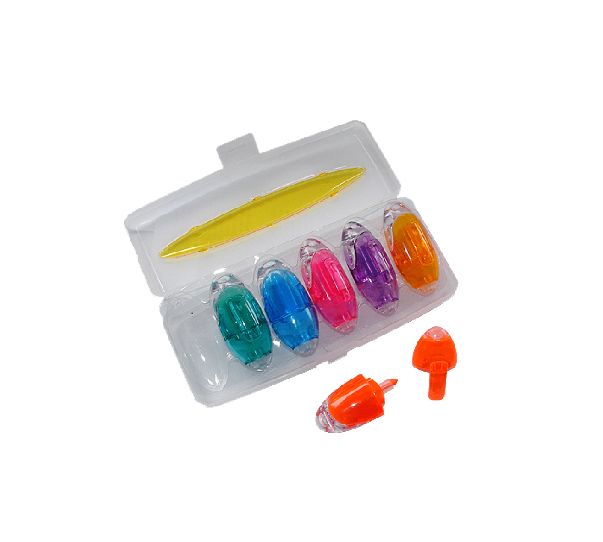 Set de seis resaltadores incertados en un termoformado con su caja contenedora de PVC con ventana oval en amarillo traslucido y cierre.