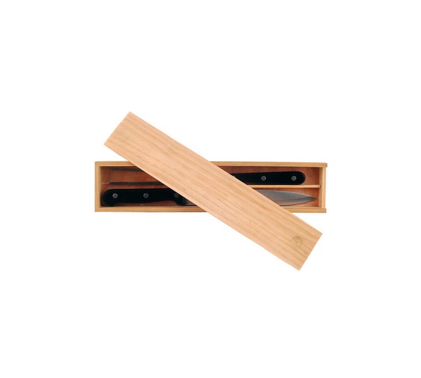 34 x 4,1 x 7,3 cm. Juego de cuchilla y tenedor en caja de madera.