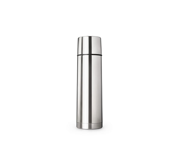 Termo de acero inoxidable 304. Posee tapón hermético a rosca con función anti derrame. Tapa con superficie plana estable para su función de vaso. Producto aprobado por el I.N.A.L. para el contacto con alimentos. Altura de termo cerrado: 29,7 cm / Diámetro: 8 cm. Capacidad: 1 Lt